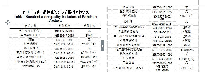 石油產(chǎn)品標(biāo)準(zhǔn)的水分質(zhì)量指標(biāo)見表 1。