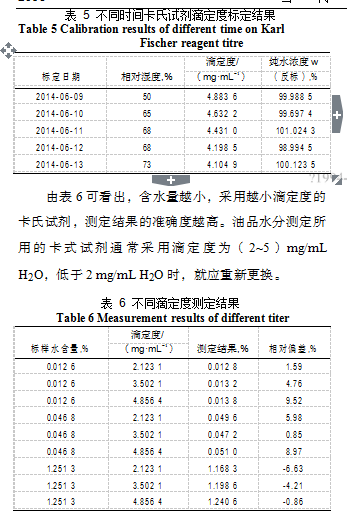 由表 5 可以看出,隨著時(shí)間的推移,卡氏試劑滴定度下降,是因?yàn)榭ㄊ显噭┦芸諝庵兴挠绊懀礈y試環(huán)境的濕度的增大。由于卡式試劑穩(wěn)定性隨時(shí)間不斷變化,所以測定新樣品時(shí),需要重新標(biāo)定滴定度,并用卡氏試劑循環(huán)沖洗滴定管。